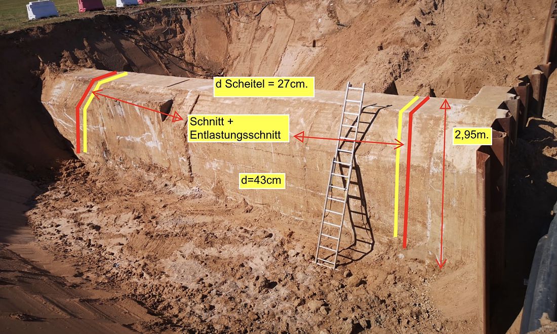 An einer Bahntrasse der Deutschen Bahn wurde mittels Seilsäge ein Stahlbetonbauwerk 2,50 m tief für eine Wort Durchleitung aufgeschnitten.