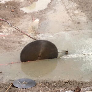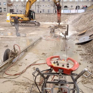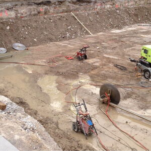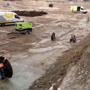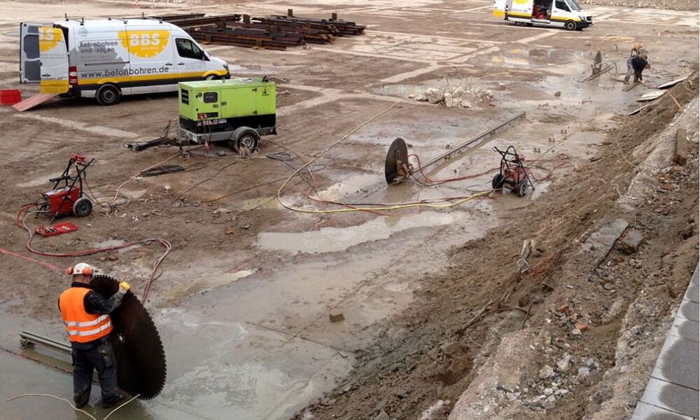 Die nach dem Abriss noch vorhandene Fundament-Bodenplatte muss für bauliche Maßnahmen teilweise zurückgebaut werden. Zu diesem Zweck führen drei Mitarbeiter mit drei Betonsägen 270 laufende Meter Trennschnitte, 70 cm tief, aus. Anschließend wird der Beton ausgestellt und entsorgt.