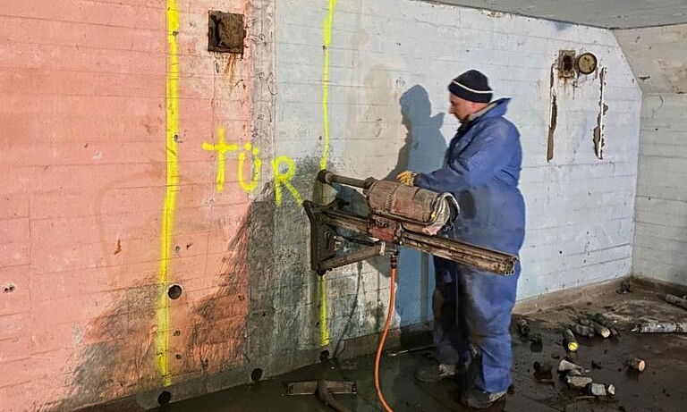 In einem Betonbunker in Bremen, der als Oldtimergarage genutzt wird, haben wir in mehreren Wänden 900er Kernbohrungen (DM: 90 cm) als Fensteröffnungen ausgeführt.