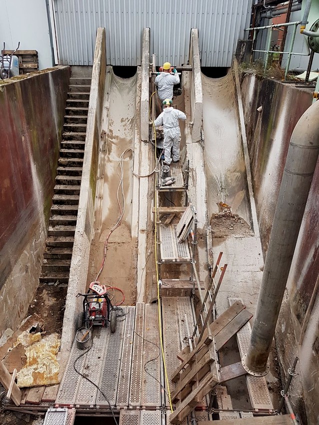In Neuss im Ruhrgebiet wurden Oberleitungsmasten aus Stahlbeton ebenerdig mittels Wandsäge abgeschnitten.