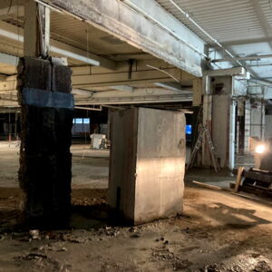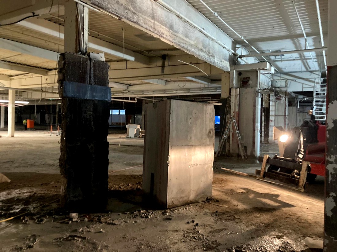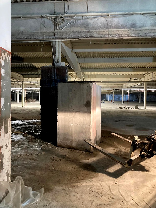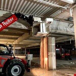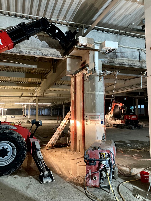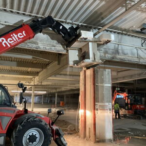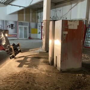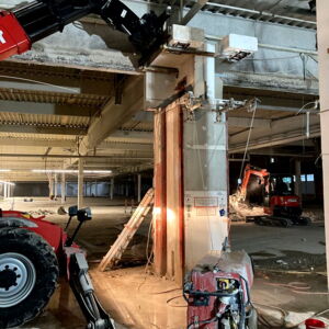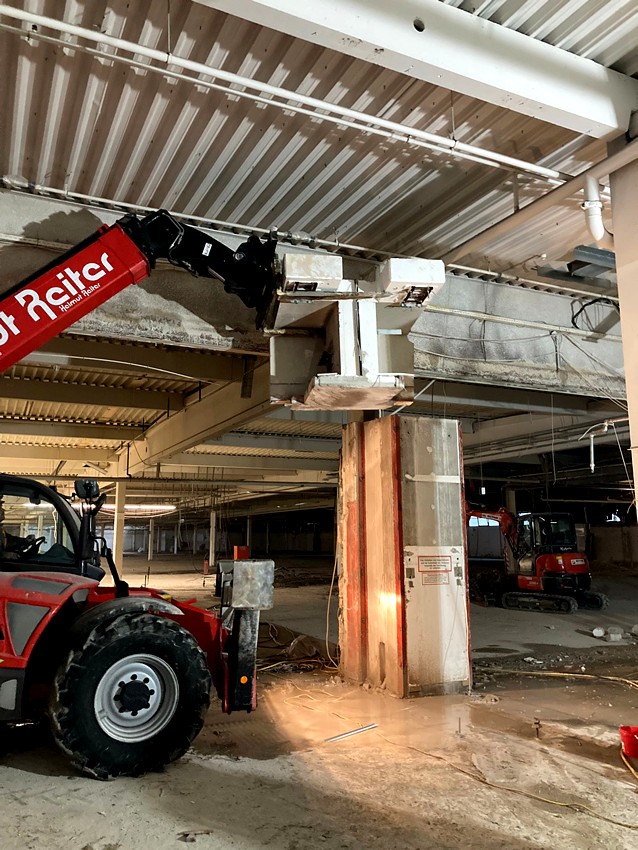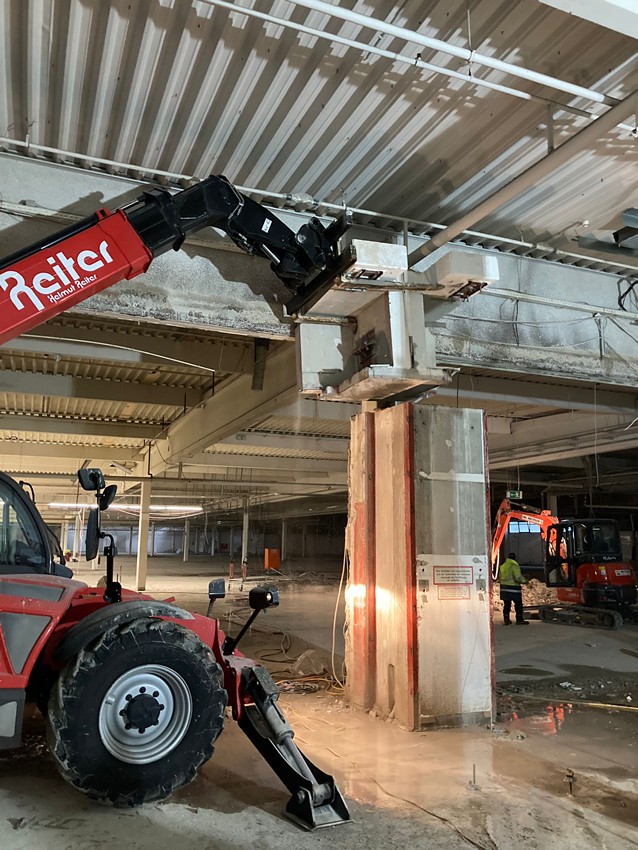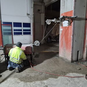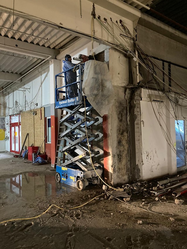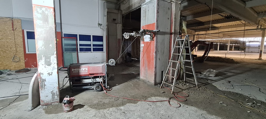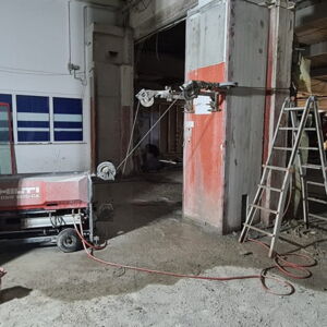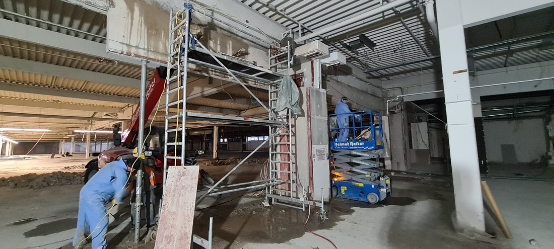 In einem Gewerbetrieb wurden ca. 24.000 Kernbohrungen  und ca. 64 qm Stahlbeton in Stücke zu etwa 3,5 Tonnen zerschnitten. Es standen nur 7 Arbeitstage zur Verfügung.