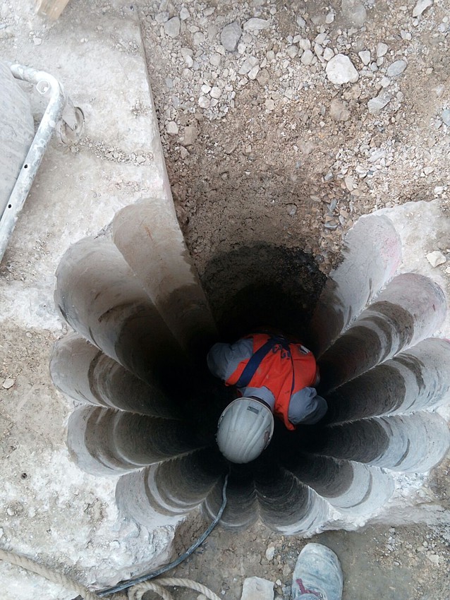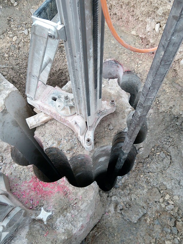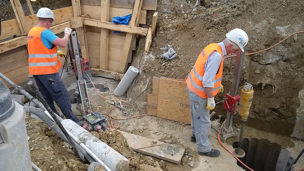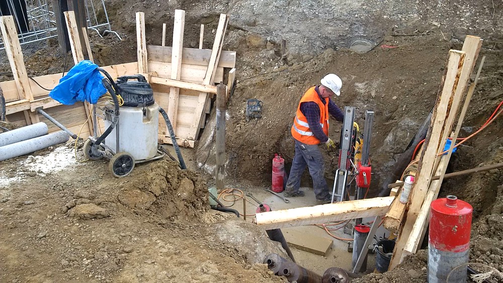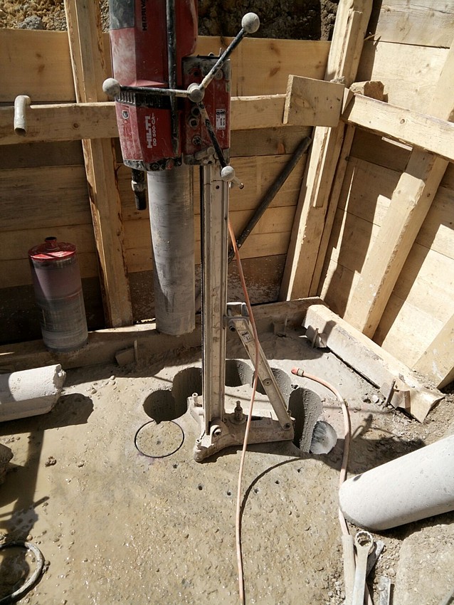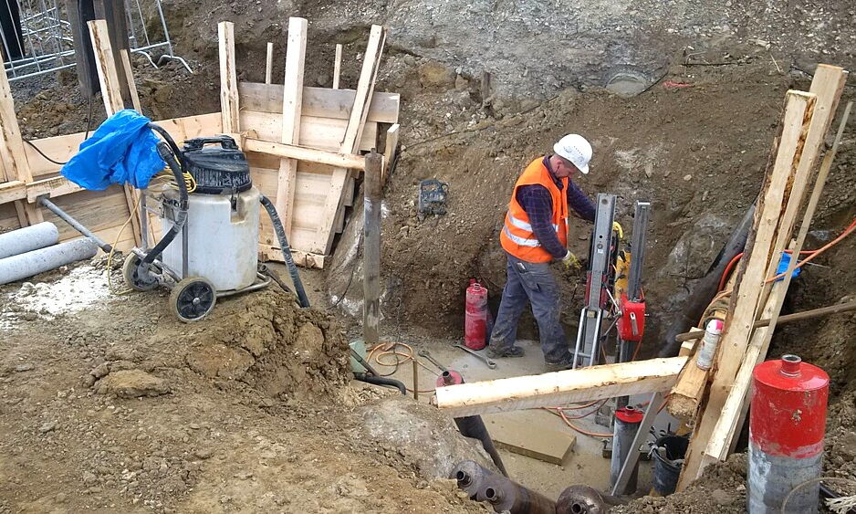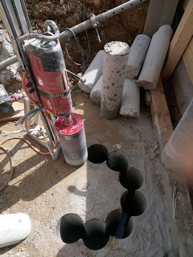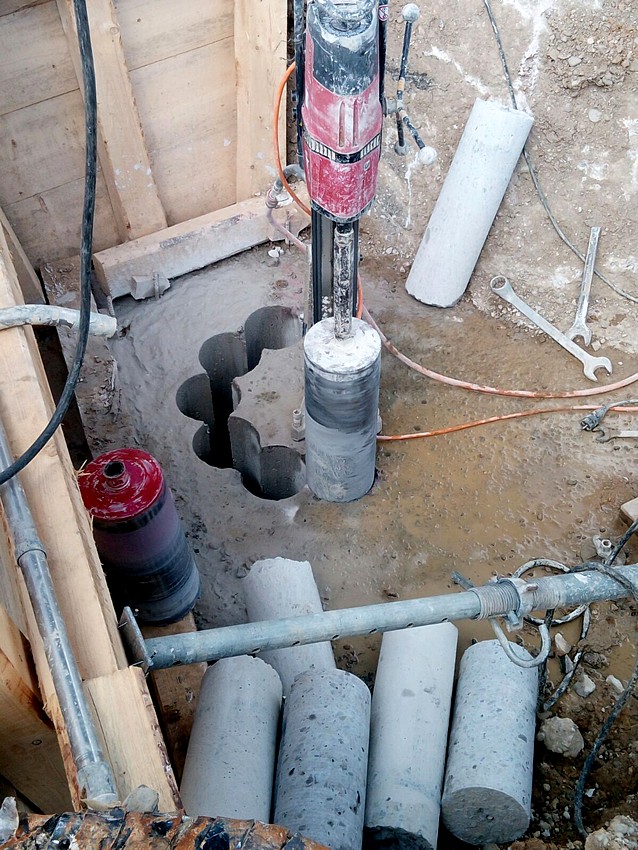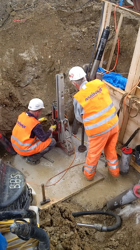 Bei Denkendorf in Baden-Württemberg wird im Rahmen eines Bahnprojektes ein Tunnel gebaut. Dafür mussten im Auftrag der Deutschen Bahn elf Kernbohrungen, 4 m tief, mit einem Durchmesser von 65 cm, durch vorhandene Stahlbetonfundamente hindurch, ausgeführt werden.